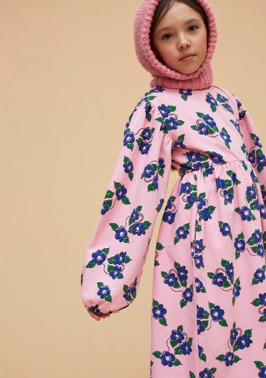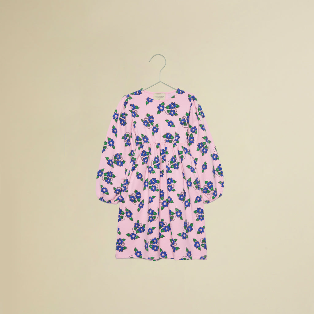 Vestito maniche lunghe rosa con fiori azzurri, in cotone organico, con vita arricciata