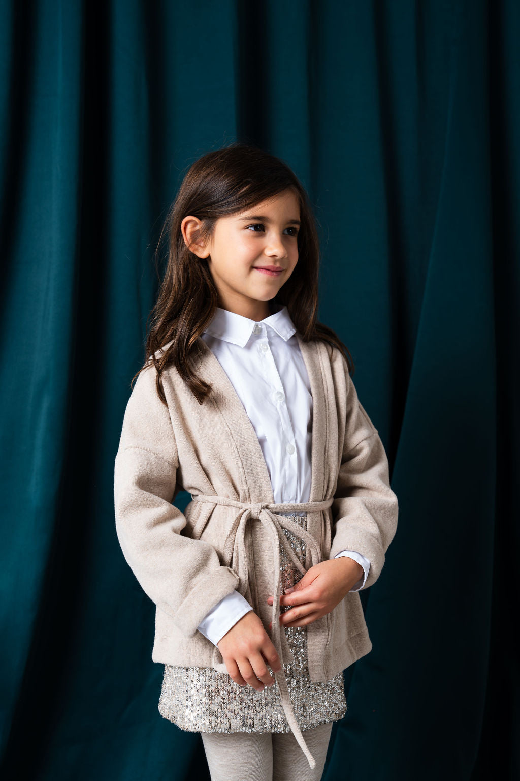 Cardigan in caldo cotone color orzo, si chiude con una piccola cinturina in vita. L'interno è felpatino per un capo comodo e caldo per le occasioni più formali. Le vostre bambine adoreranno! Made in Italy