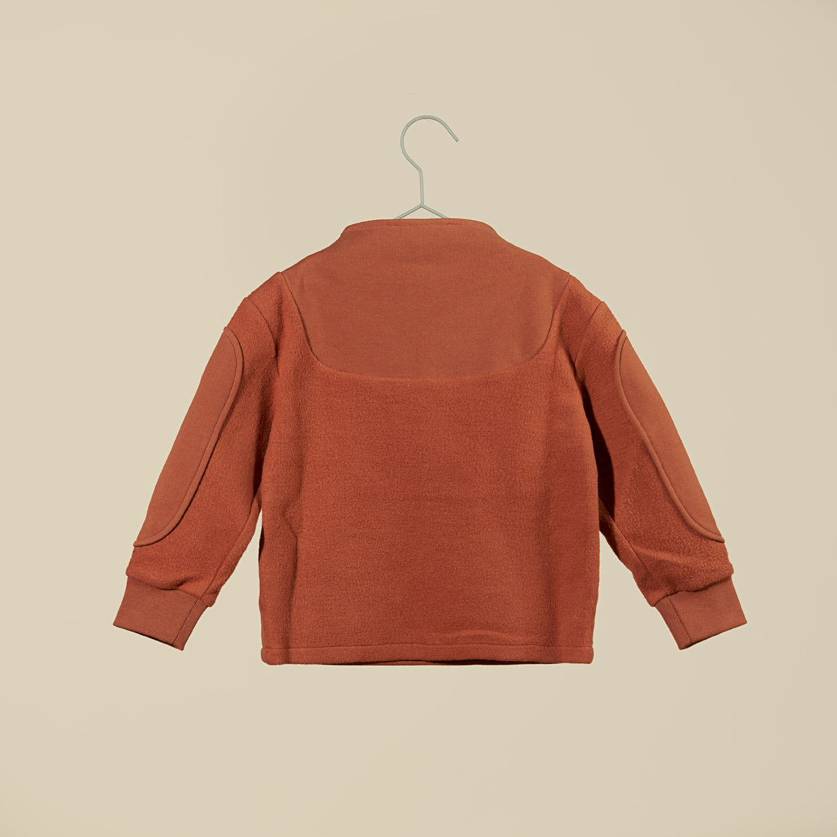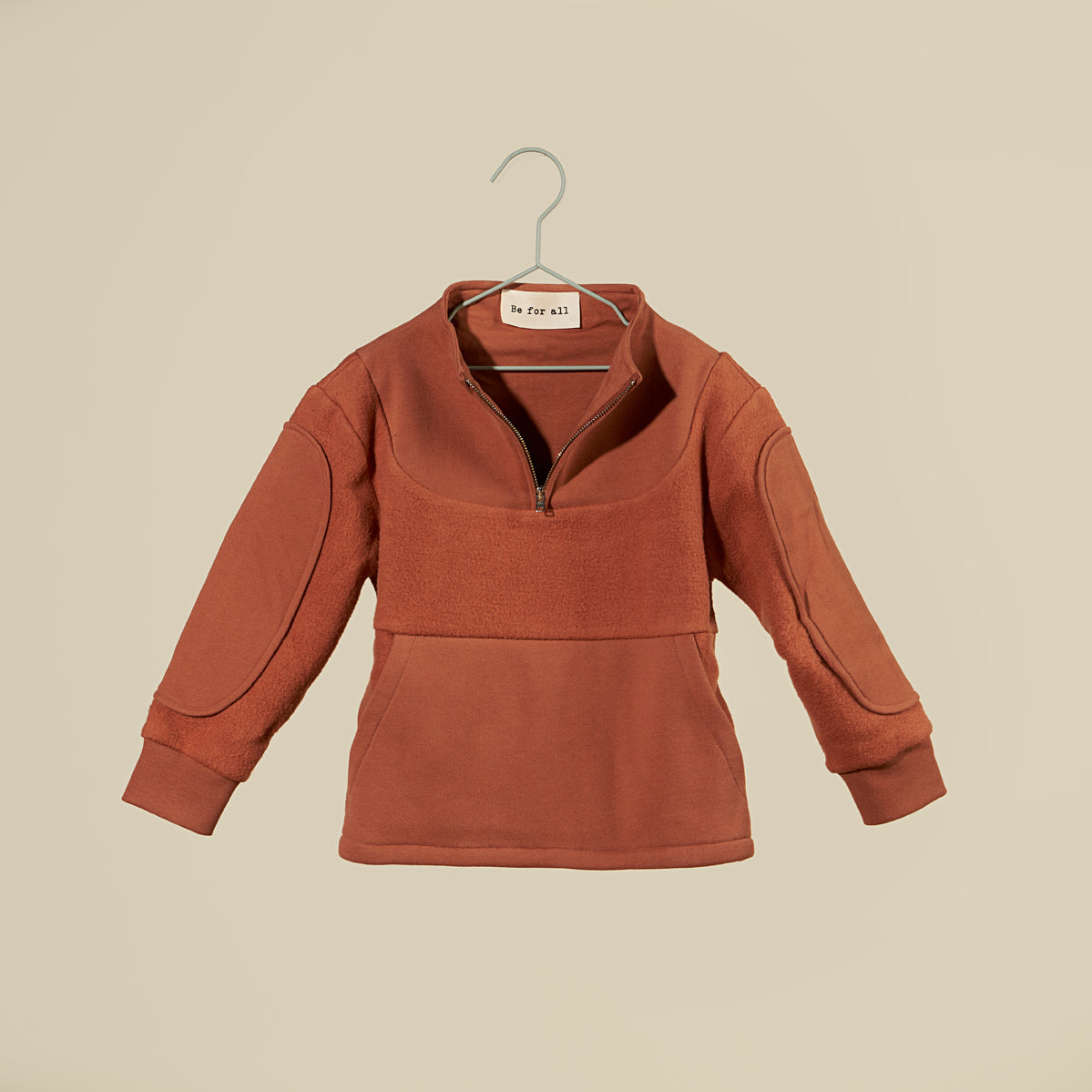 Felpa in cotone agnello con toppe color coccio, con piccola zip sul collo. Calda ed avvolgente nelle giornate più fredde.