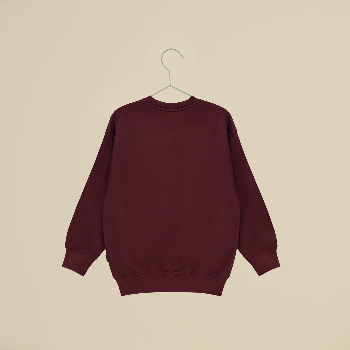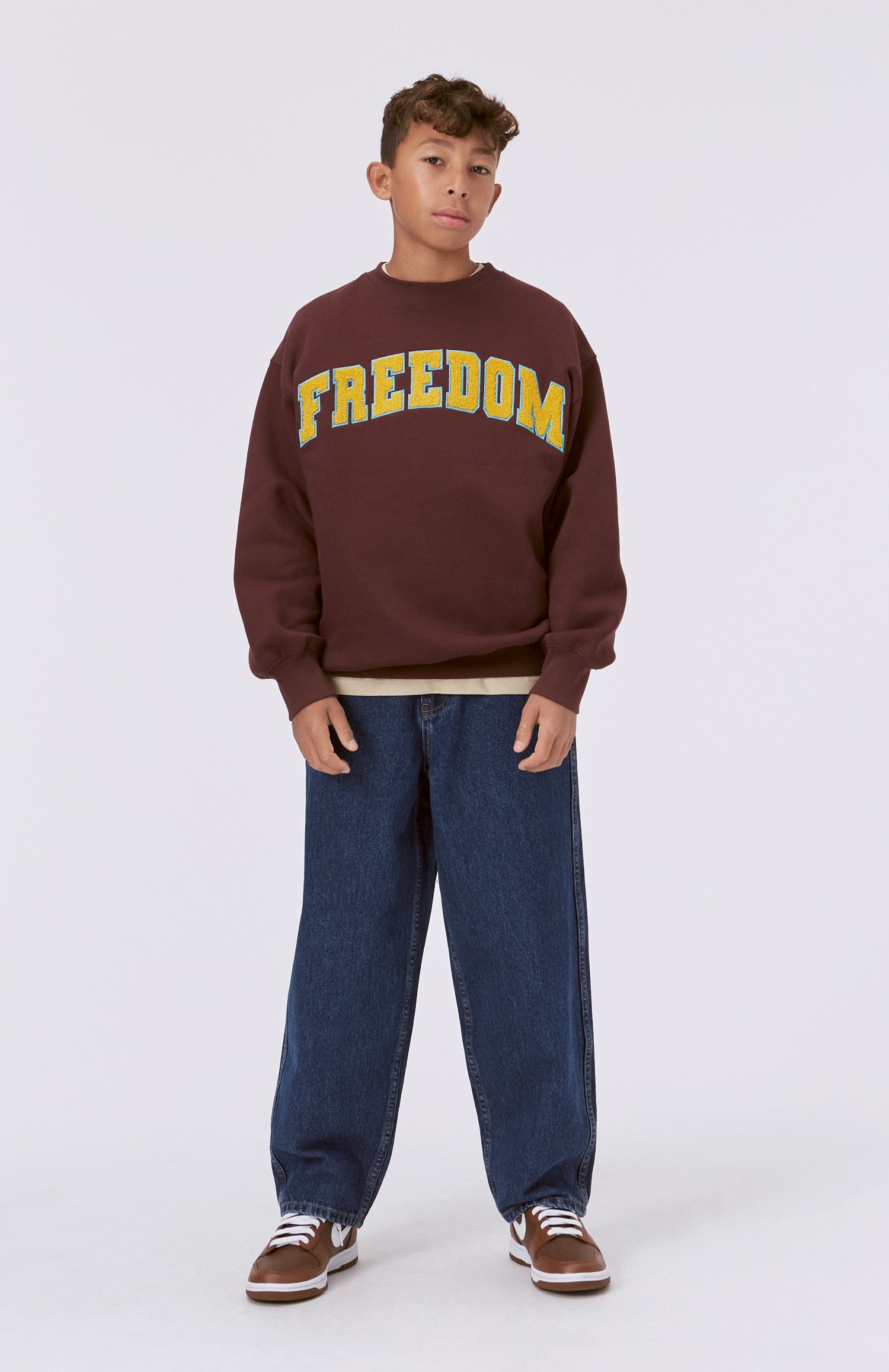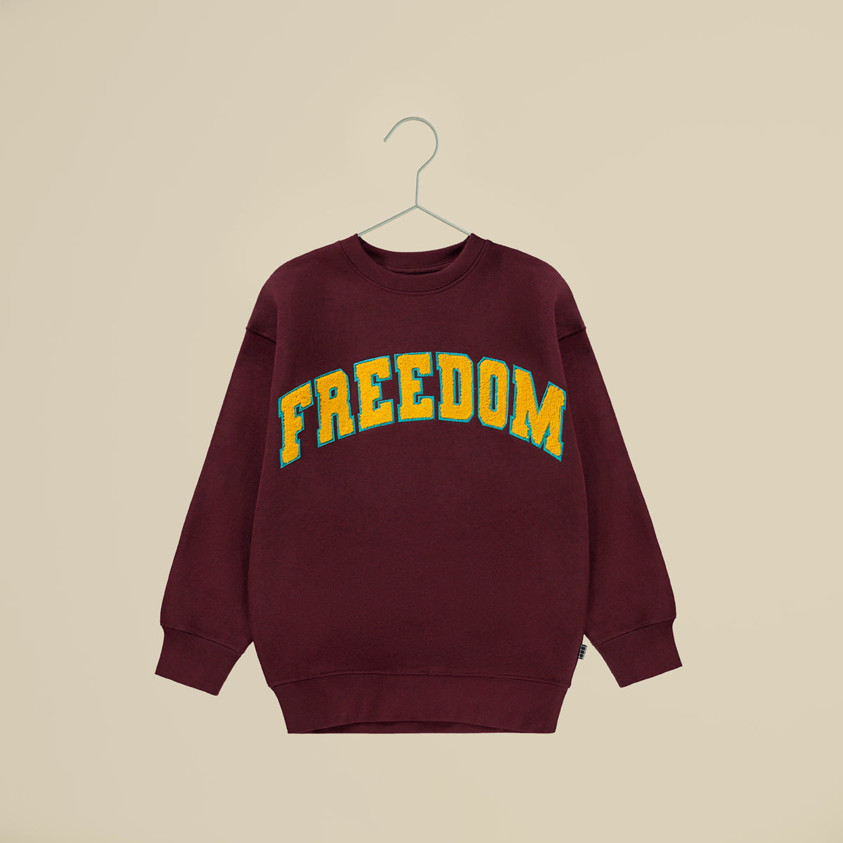 Felpa girocollo bordeaux con ricamo frontale blu e giallo "Freedom", in cotone organico, vestibilità ampia.