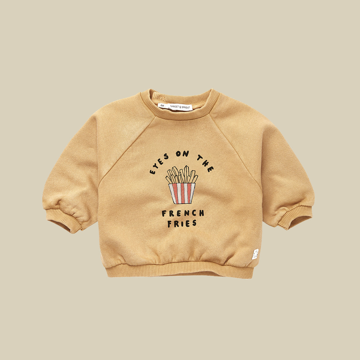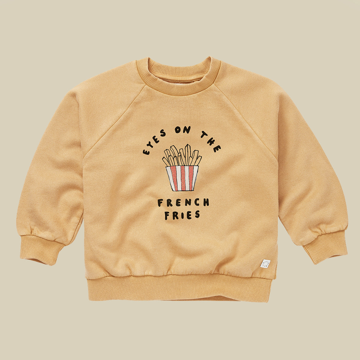 Felpa sabbia stampa French Fries, in cotone biologico, perfetta per lei e per lui.