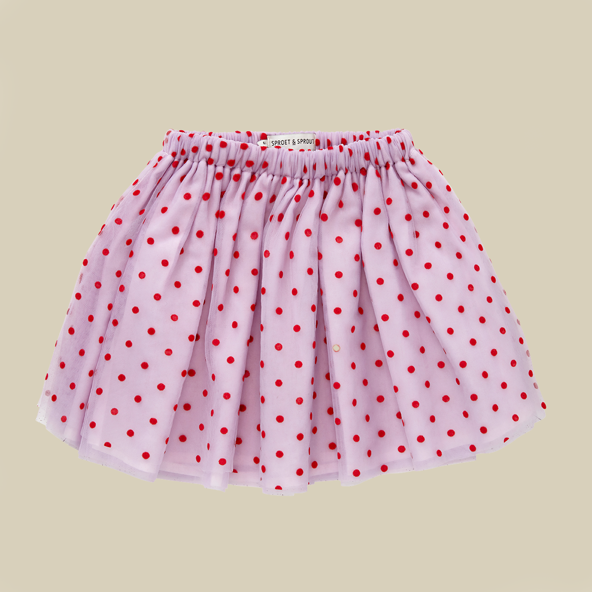 Gonna in tulle color lavanda con pois rosso vivo ideale per muoversi e volteggiare. Con i suoi strati multipli arricciati che le conferiscono volume e la morbida fascia elastica in vita, è un capo divertente e festoso, ricco di fascino giocoso.