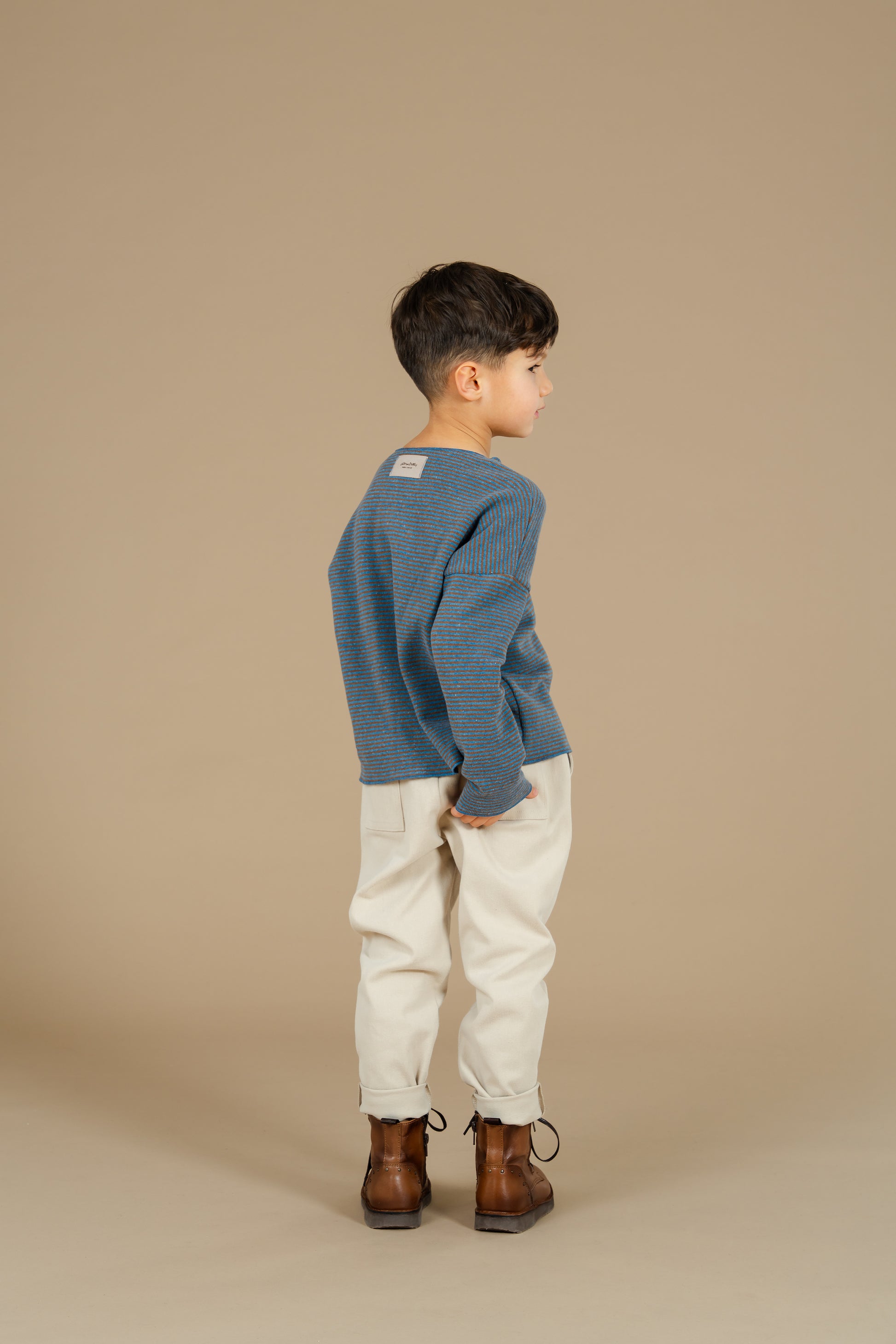 Maglia in caldo cotone con microrighe tabacco e cobalto, morbido e unisex! Scollo ampio.