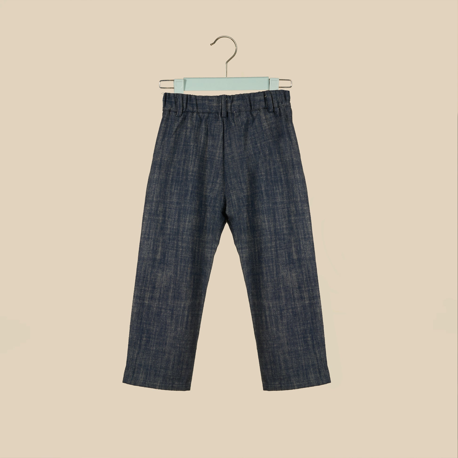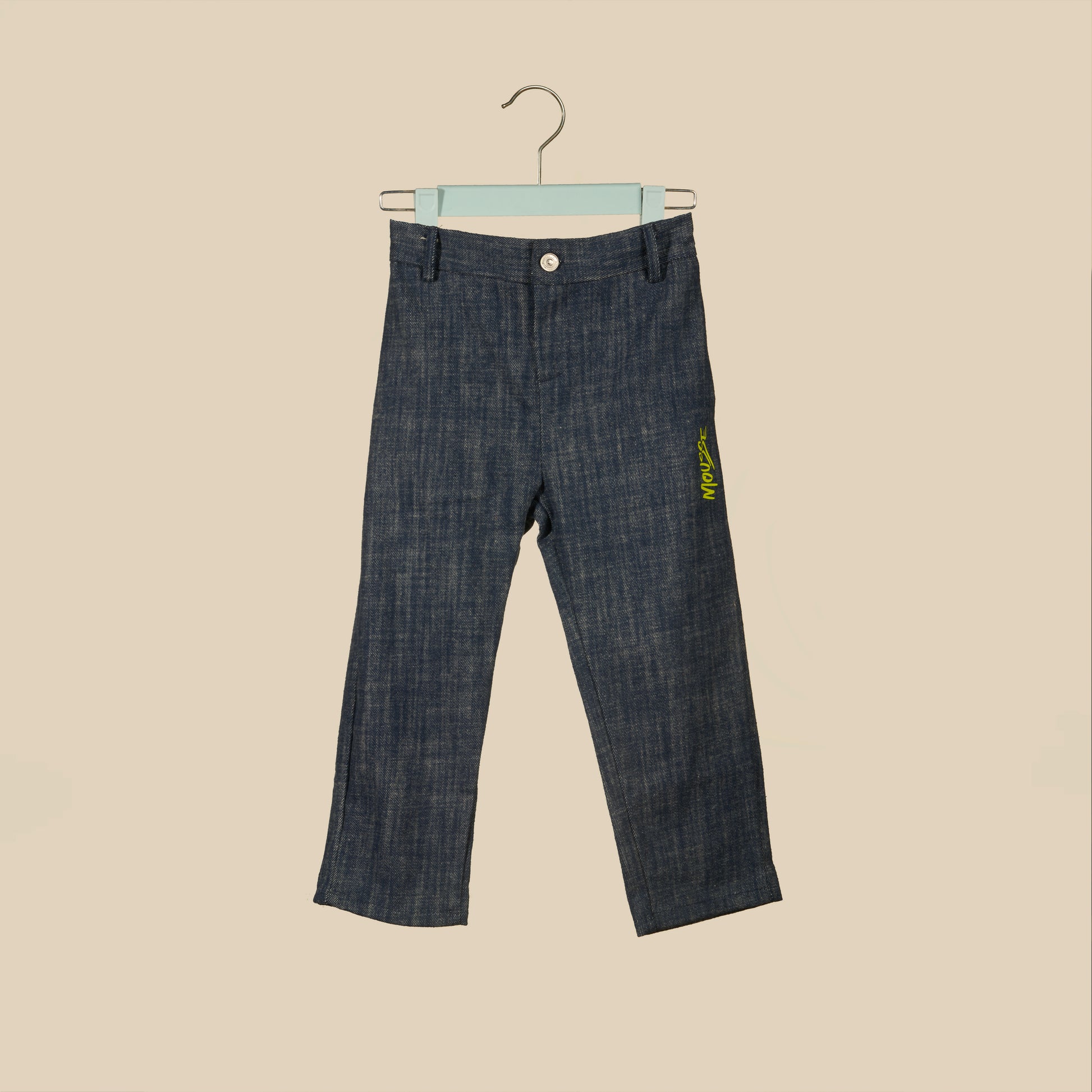 Pantalone color denim in morbido cotone, tasche laterali, piccolo logo sul fianco, si chiude con un bottone ma ha anche un comodo elastico in vita per adattarsi perfettamente al tuo bambino!