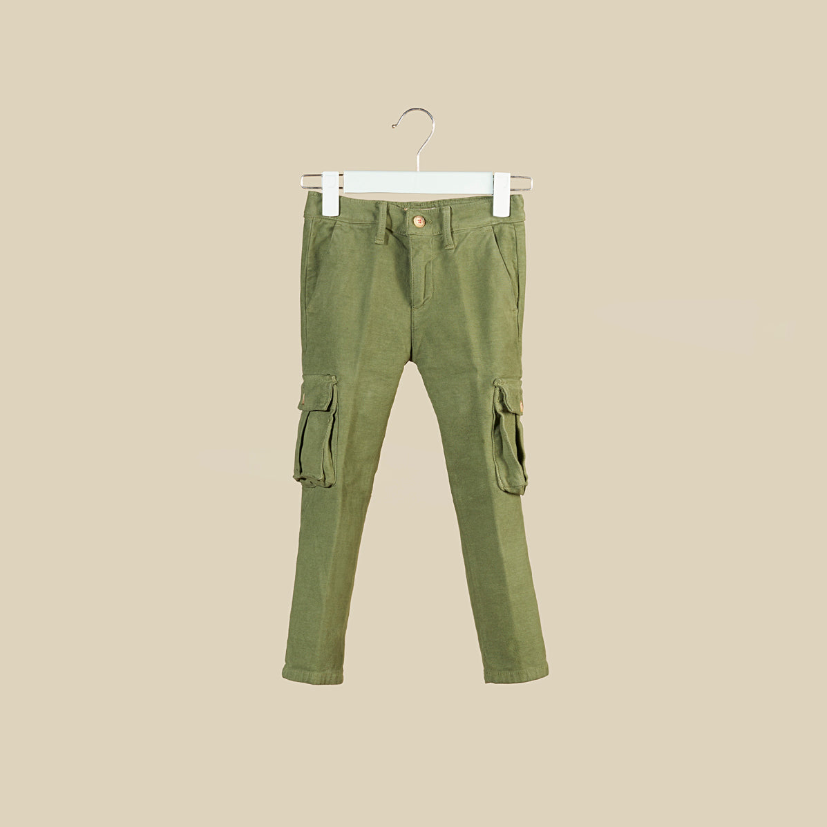 Pantalone in fustagno verde militare con tasconi sulle gambe, tinto capo, bottone con zip e vita regolabile grazie all'elastico interno. Morbido al tatto, caldo, resistente, piacevole da indossare.