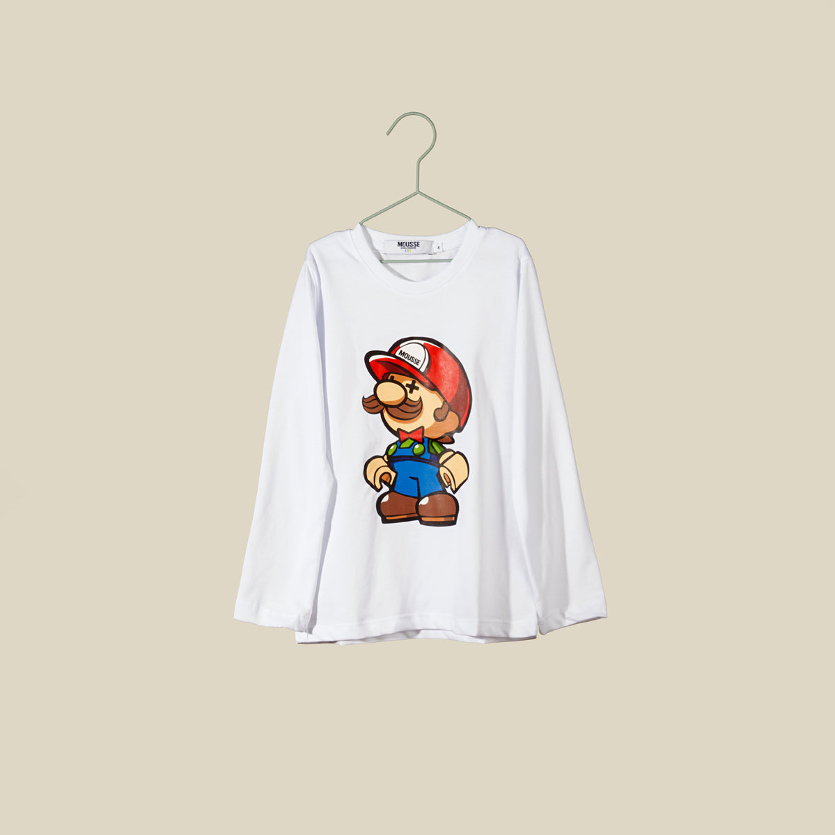 T-shirt bianca a manica lunga con Super Mario, vestibilità classica.