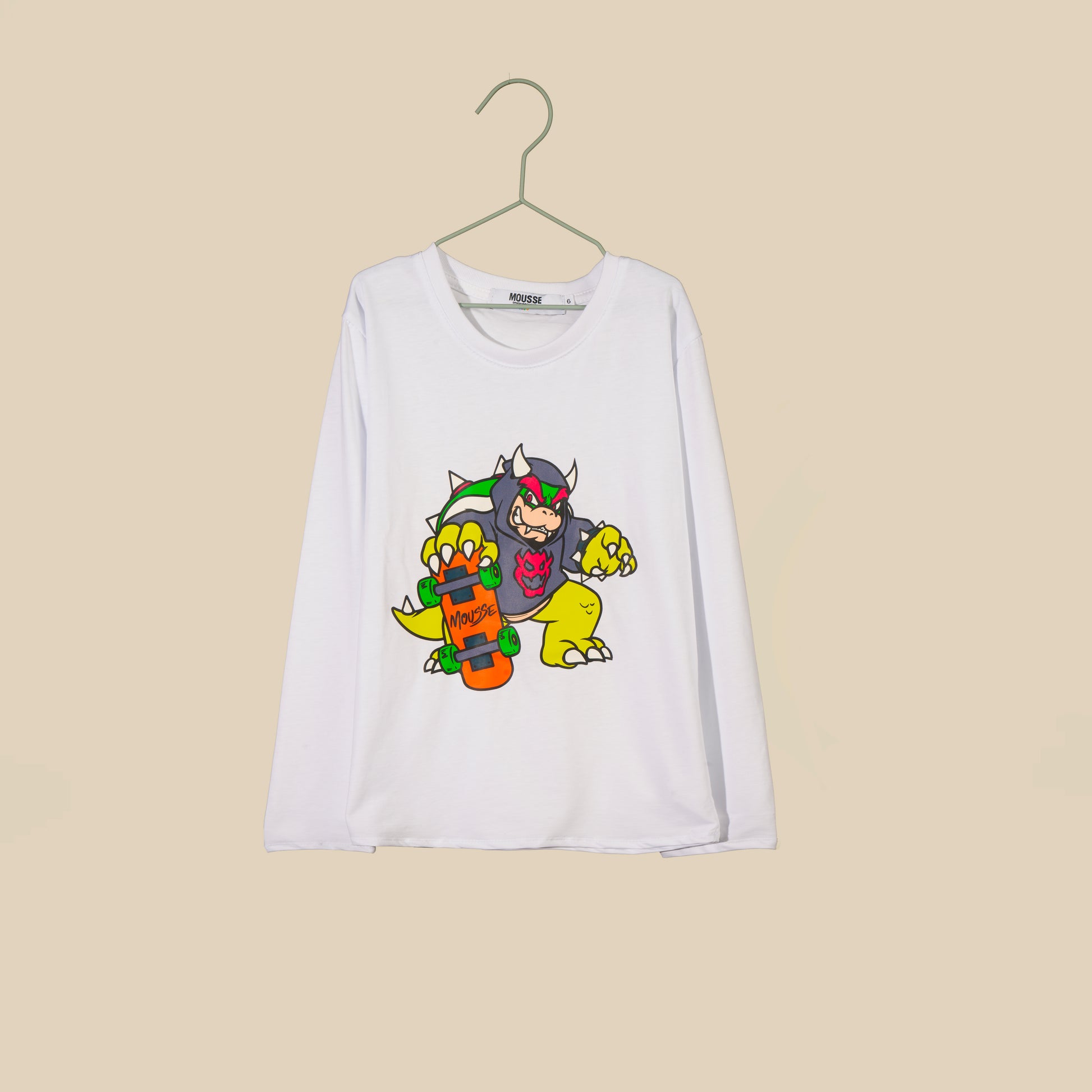 T-shirt bianca manica lunga con Bowser che va sullo skate, morbida e perfetta per la scuola e per le giornate di relax! Abbinala alla felpa e ai pantaloni!